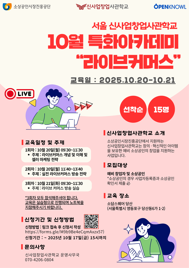 10월 특화아카데미는 '라이브커머스'를 주제로 실습형 프로그램이 진행되며, 소담스퀘어(당산)에서 진행됩니다.