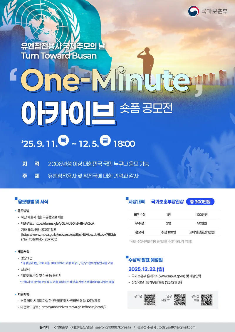 국가보훈부 국제협력담당관실: saerongi1000@korea.kr / 공모전 주관사: todaysoft01@gmail.com