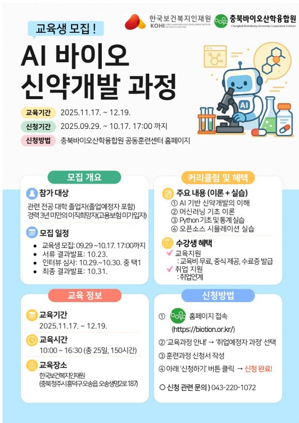 "AI 바이오 신약개발 과정(1차)"이 개설되었으니 많은 관심 부탁드립니다