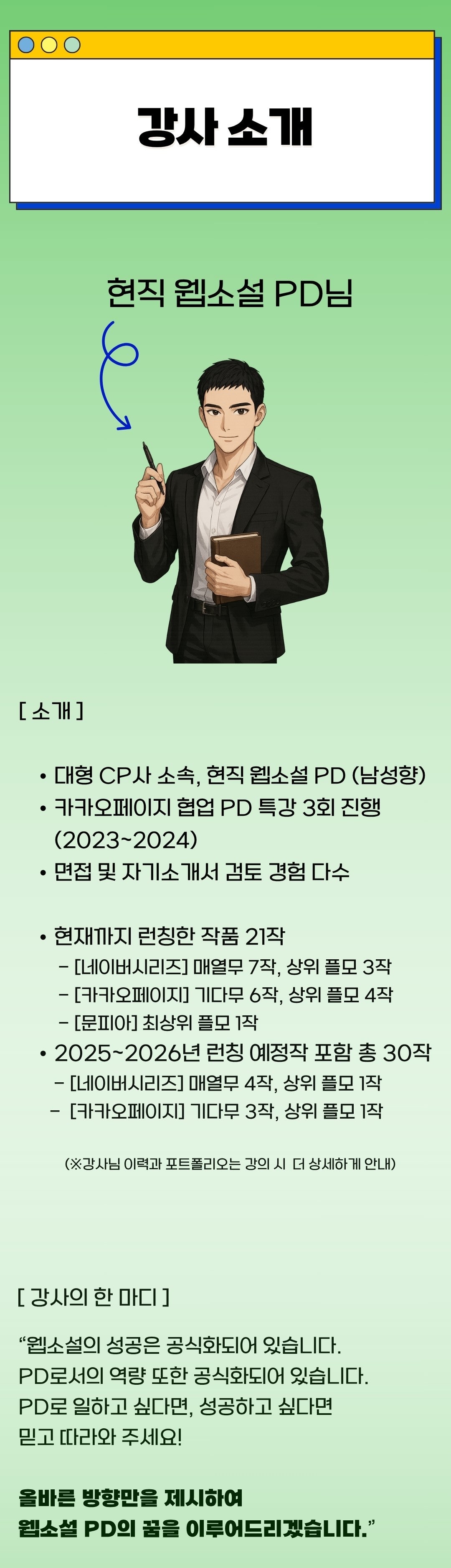 시중에 웹소설 쓰는 법을 알려주는 강의는 많지만, ‘웹소설 PD가 되는 법’을 체계적으로 알려주는 강의는 드뭅니다.