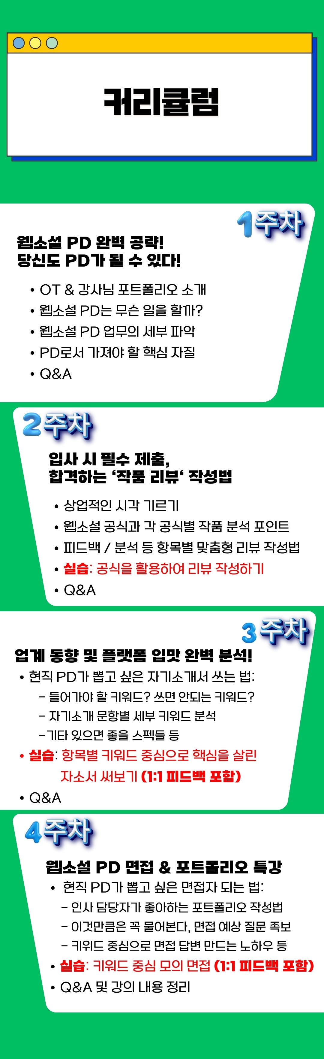 현직 웹소설 PD가 최신 트렌드를 반영한 강의와 실습, 1:1 피드백, 모의면접까지 PD 취업 준비 과정에 도움을 드립니다.