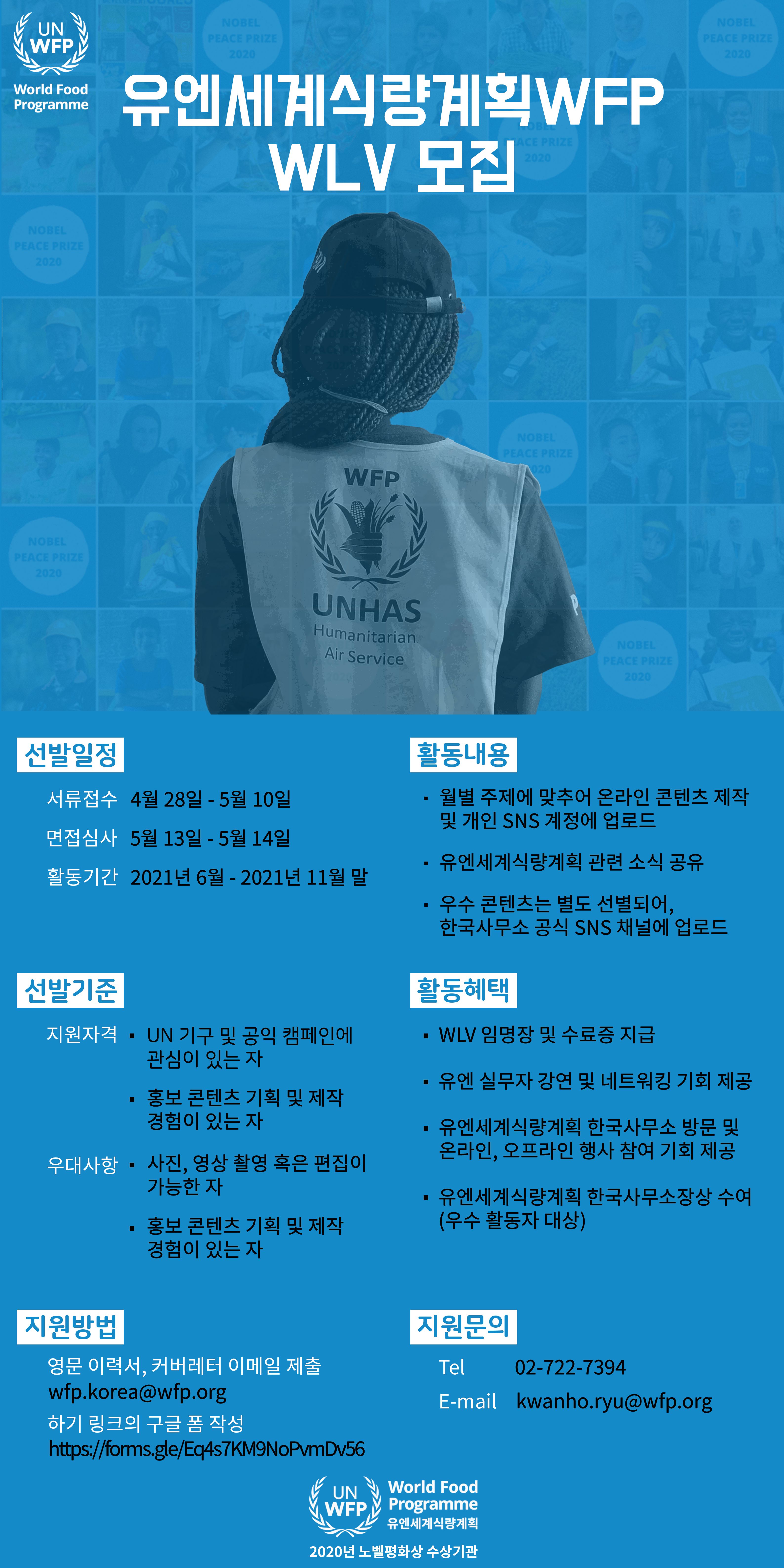 -WLV 모집은 유엔 공식 채용 절차에 따라 이루어지며, 그로 인해 소정의 비용(간단한 건강 검진)이 발생할 수 있다는 점 양해 부탁드립니다.