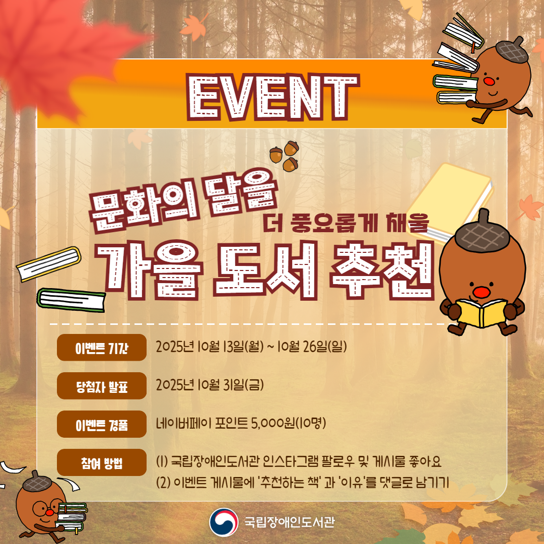 ※ 이벤트 참여 댓글의 추천 책은 국립장애인도서관 콘텐츠에 활용될 수 있습니다.