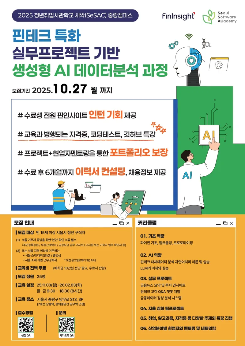 금융 산업에 특화된 프로젝트 기반으로 생성형 AI 및 데이터 분석 역량을 집중적으로 강화합니다.