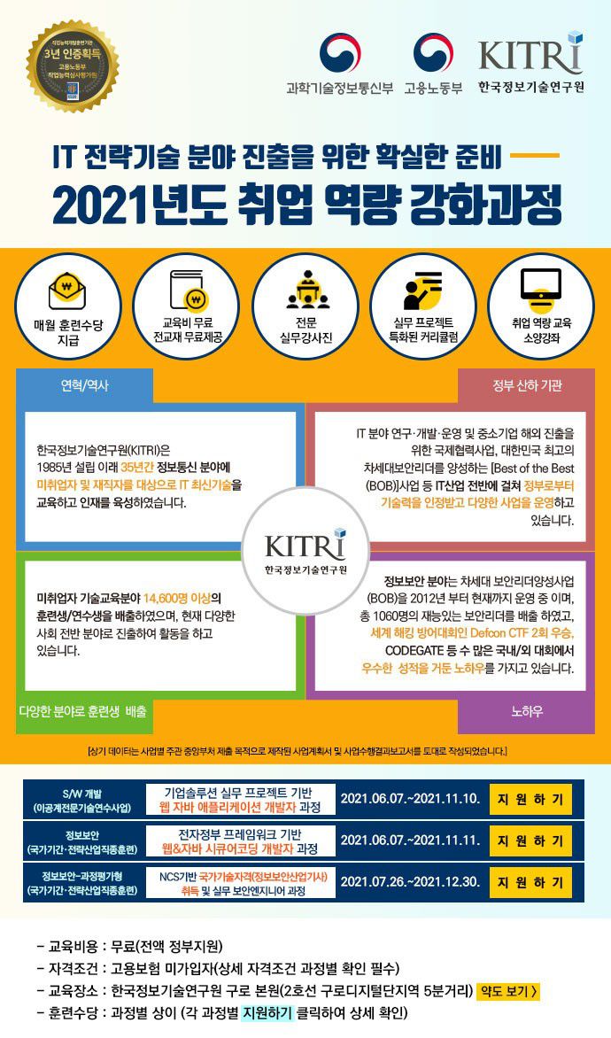 우리 연구원에서 미취업자를 대상으로 2021년도 6월 IT 취업 역량 강화 과정을 오픈했습니다~