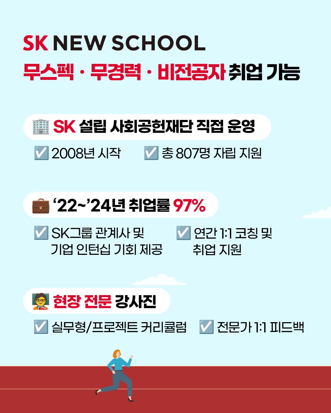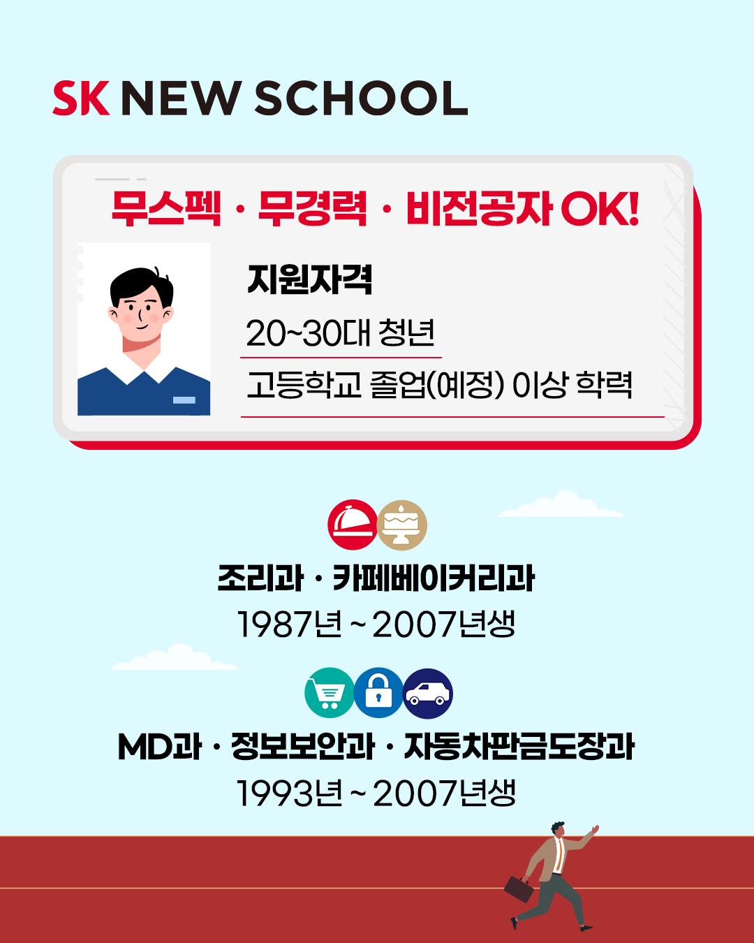 ✅ 셰프, 파티셰, MD(상품기획자), 정보보안전문가, 자동차 판금도장 테크니션을 꿈꾸는 청년이라면 SK 뉴스쿨에 지원하세요!