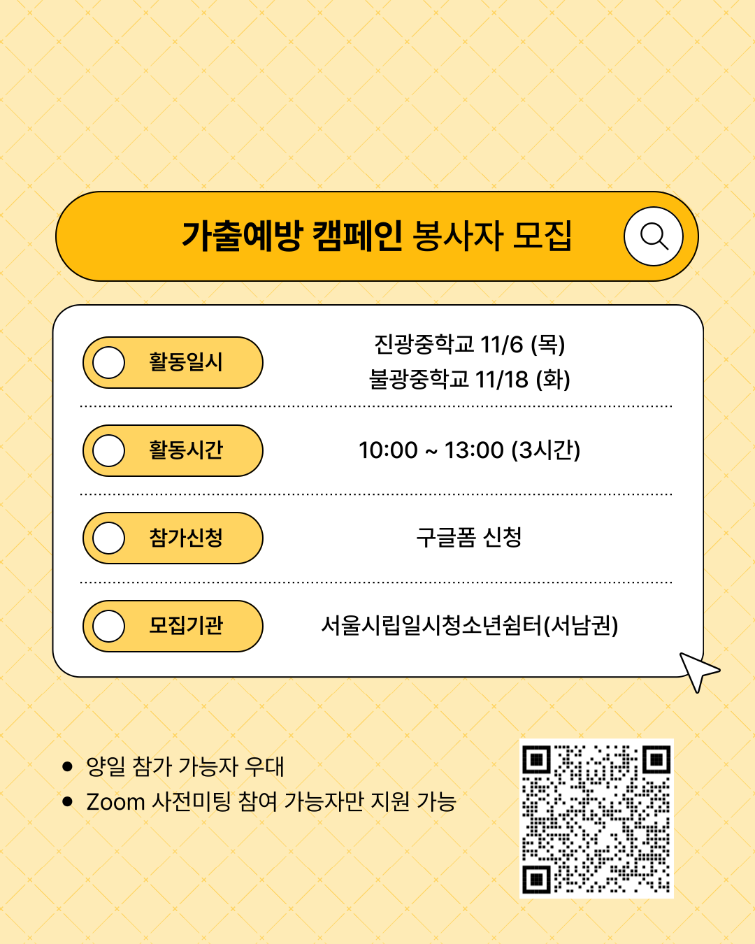 안녕하세요, 대한민국대학생교육기부단X서울시립일시청소년쉼터(우리별)에서 청소년을 위한 가출예방캠페인 부스 활동을 함께 할 대학생 자원활동가를 모집하고 있습니다!