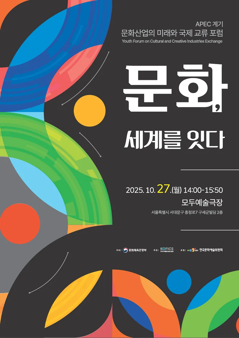 문체부 차관과 문화산업 전문가, APEC 국가 출신 전문가와 외국인 인플루언서 및 유학생이 만나 미래 문화산업의 가치에 대해 이야기 하는 포럼에 관심있는 학생 및 청년 여러분의 많은 관심과 지원 바랍니다.