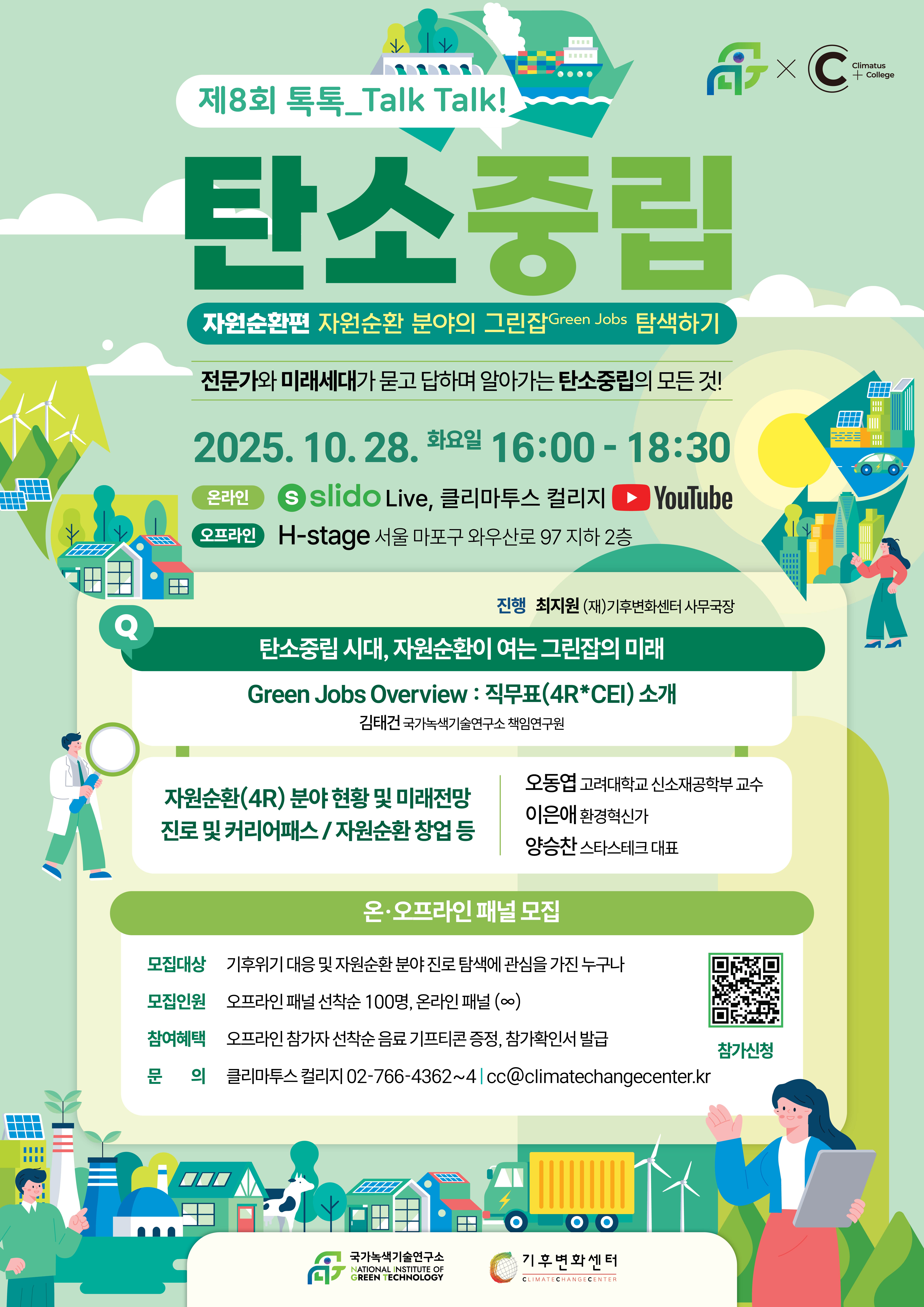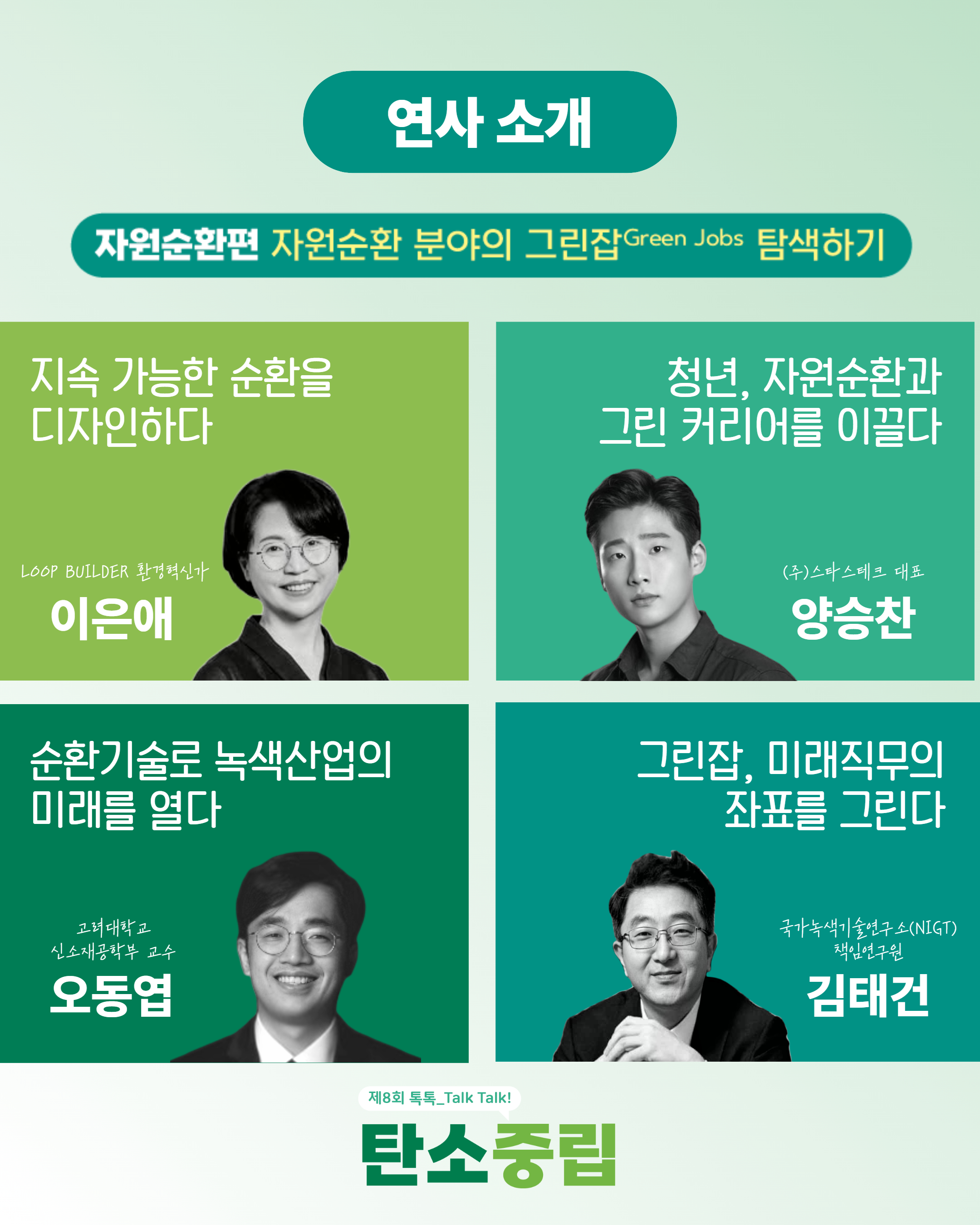오는 10월 28일(화) 진행되는 「제8회 톡톡_TALK, TALK! 탄소중립 : 자원순환&그린잡」에서는 탄소중립 시대에 필수적인 자원순환(4R) 분야와 그린잡(Green Jobs)에 대해 전문가와 미래세대가 함께 질문하고 소통하며, 자원순환의 현황과 미래 전망, 진로 및 커리어패스, 자원순환 창업을 탐색하고자 합니다.