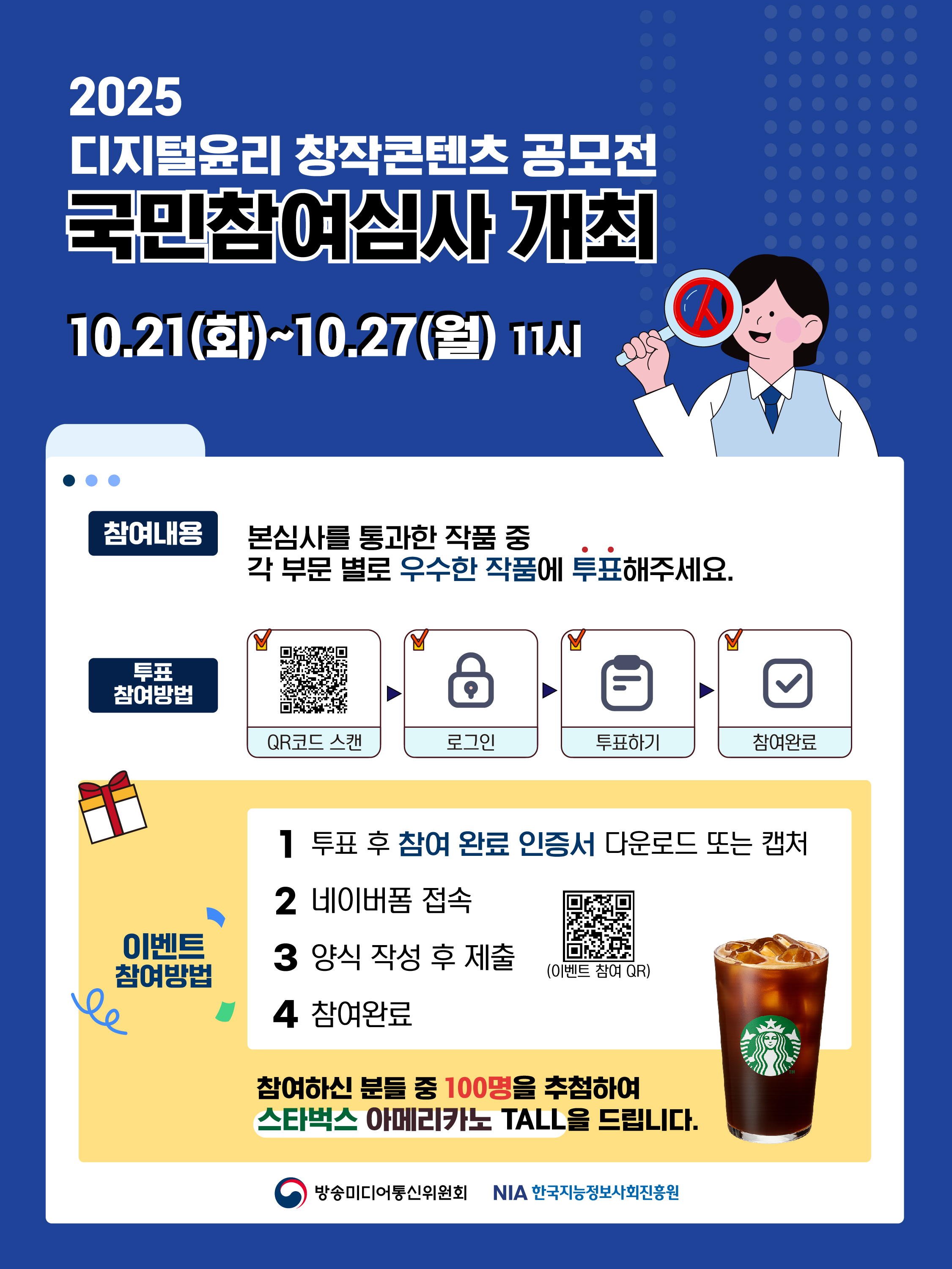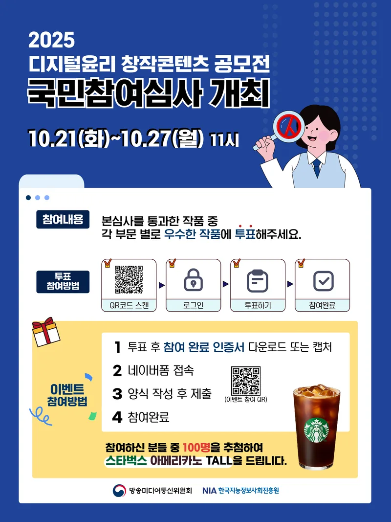 방송미디어통신위원회가 주최하고 한국지능정보사회진흥원이 주관하는 '2025년 디지털윤리 창작콘텐츠 공모전' 국민참여심사 안내드립니다.