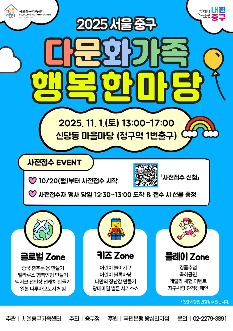서울중구가족센터에서 아래와 같이 「11월 1일 다문화가족 행복한마당 자원봉사자」를 모집하오니 자원봉사활동을 희망하는 분들의 많은 신청 바랍니다.