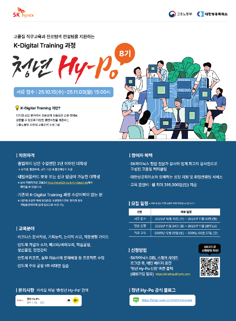 청년 Hy-Po는 SK하이닉스와 고용노동부와 함께하는 K-Digital Training 과정으로 고품질 반도체 직무교육과 진로탐색 컨설팅을 지원하는 프로그램입니다. 청년 Hy-Po는 반도체 산업 근무에 필요한 필수 직무역량을 강화하고 전문성과 실용성을 갖춘 인재로 성장할 수 있도록 반도체 기초·전문교육을 제공합니다.