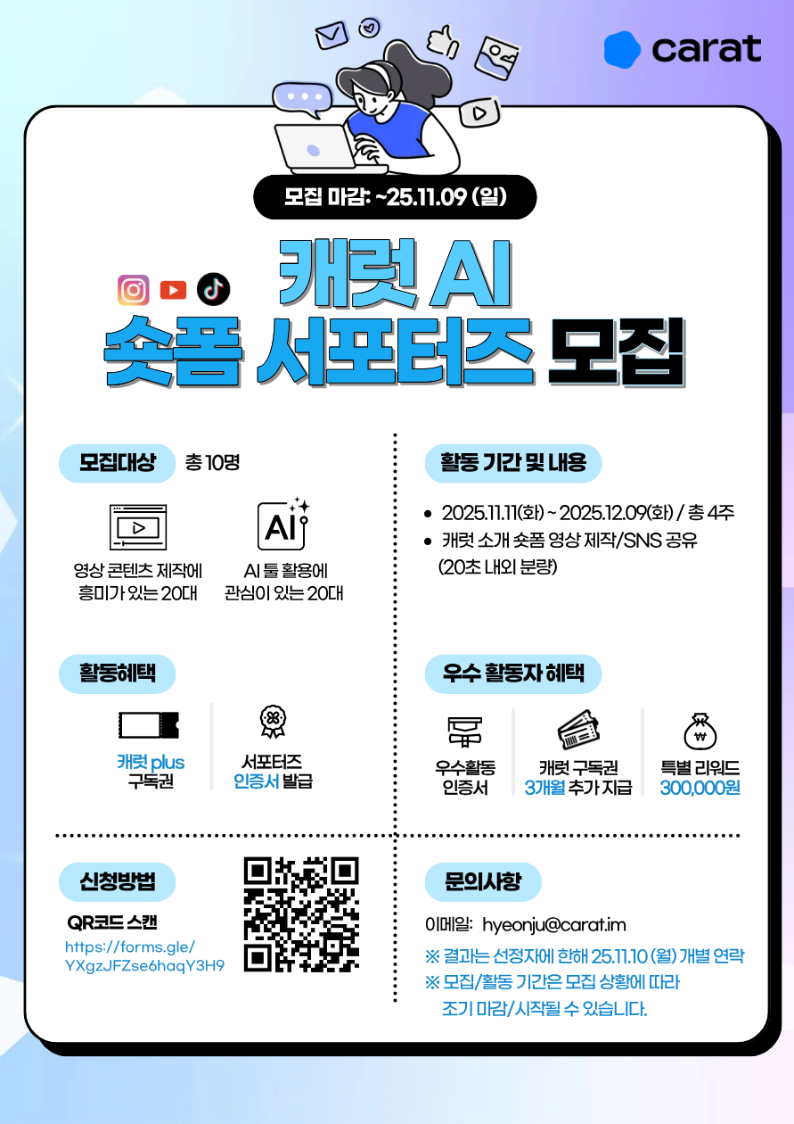 국내 최대 콘텐츠 제작 AI 플랫폼 캐럿과 함께할 ‘캐럿 숏폼 서포터즈’를 모집합니다!