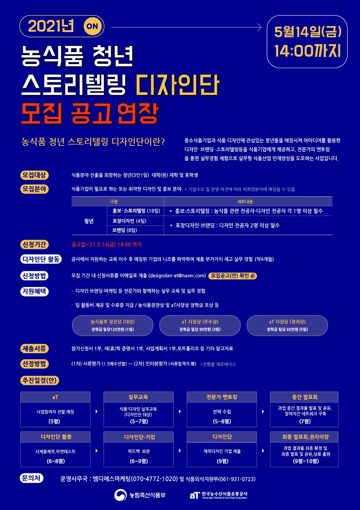 - 청년의 스토리텔링 기반 홍보·디자인 재능 활용으로 중소 식품기업의 제품 가치 제고 및 식품산업 실무형 인재 양성을 위한 사업입니다.