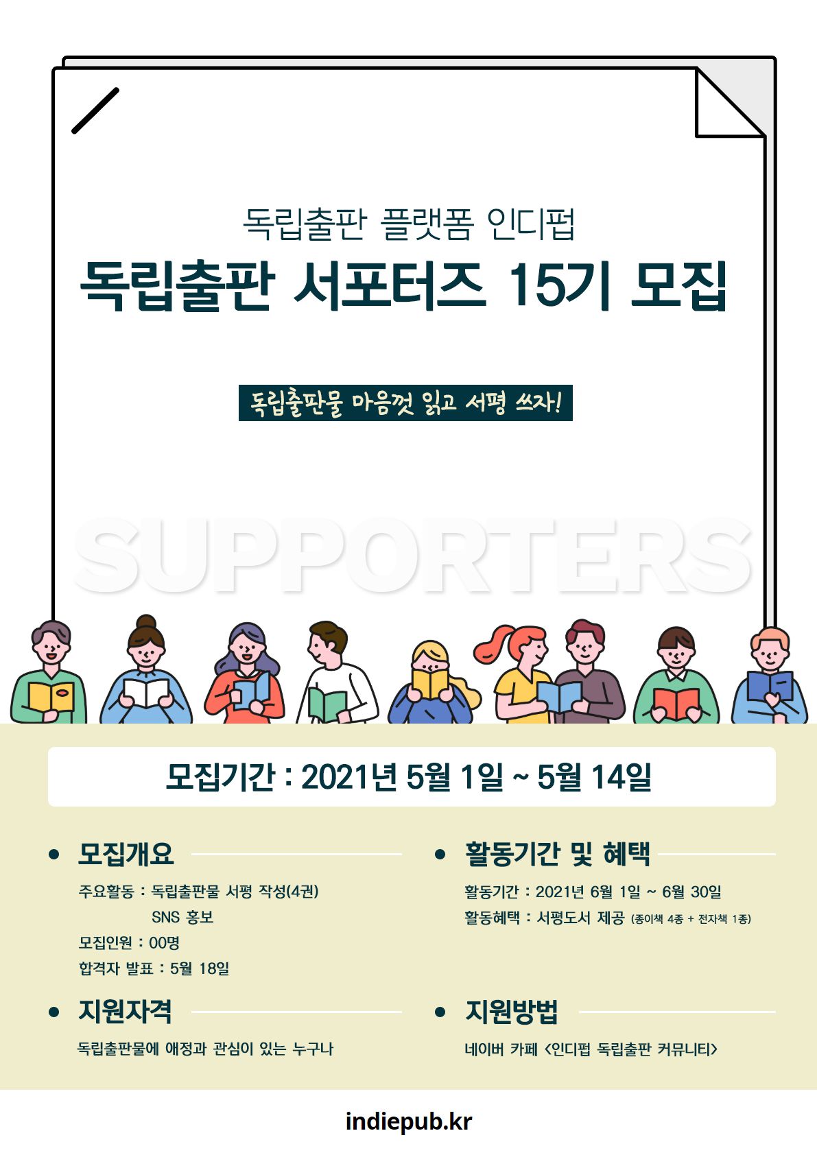 서평도서 수령 후 도서 수령 사진과 16기 독립출판 서포터즈 모집공고 포스터를 블로그(또는 SNS)에 올려주세요.