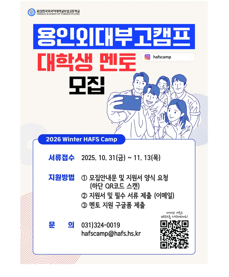 용인한국외대부설고등학교에서 주최하는 제30회 HAFS CAMP에서 참가 학생들의 대학생 멘토를 모집합니다.