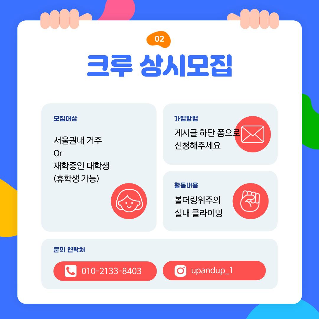 ‘업앤업’은 3명이서 소소하게 클라이밍하던 크루였으나 더 다양한 분들과 함께 하고자 점점 커진 대학생 연합 동아리입니다!🤩
