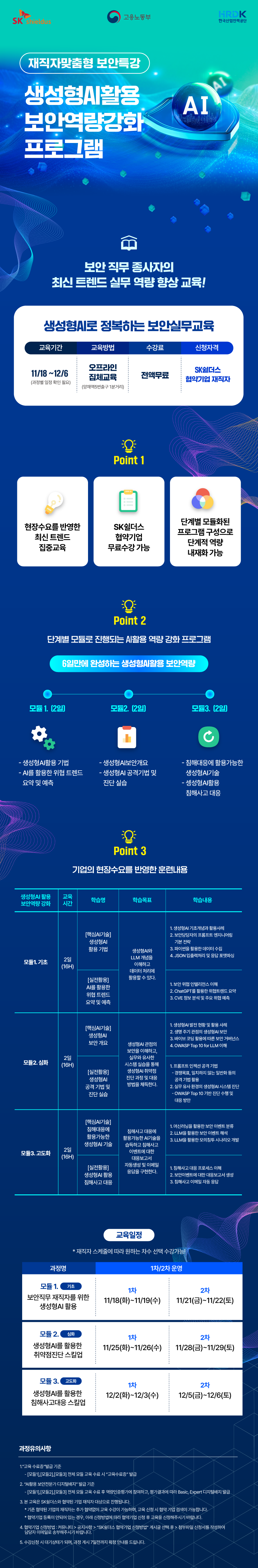 6일만에 완성하는 생성형AI 활용 보안역량! 재직자 스케줄에 따라 원하는 차수 선택 수강가능!