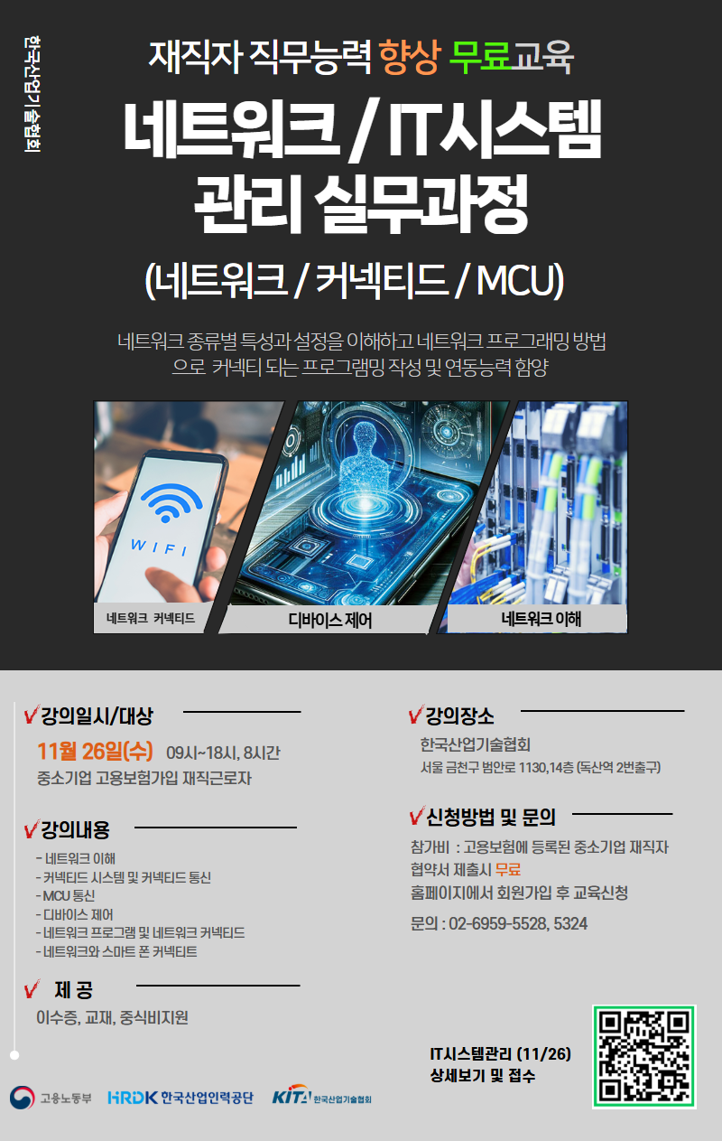 중소기업 재직자 대상으로 네트워크/it시스템관리 실무 무료교육을 개강합니다.
