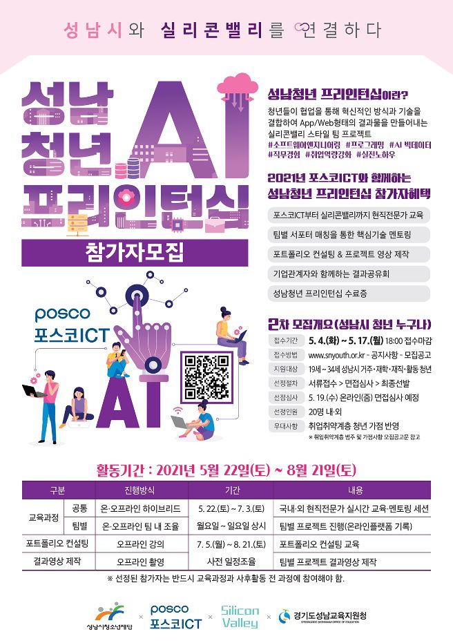 - 성남청년 프리인턴십이란, 협력기업의 인재상과 핵심역량을 기반으로 만들어진 교육과정으로 청년들이 협업을 통해 혁신적인 방식과 기술을 결합하여 App/Web 형태의 결과물을 도출하는 실리콘밸리 스타일 팀 프로젝트입니다. 미국 실리콘밸리 현직전문가 Head Instructor를 중심으로 국내외 AI 빅데이터 전문가들의 교육 및 멘토링으로 이루어지는 귀한 기회 놓치지 마세요!