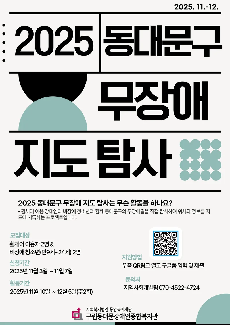 2025년 동대문구 무장애 지도 탐사 프로젝트는 휠체어 이용 장애인과 청소년과 함께 동대문구의 무장애길을 직접 탐사하여 위치와 정보를 지도에 기록하는 프로젝트입니다.