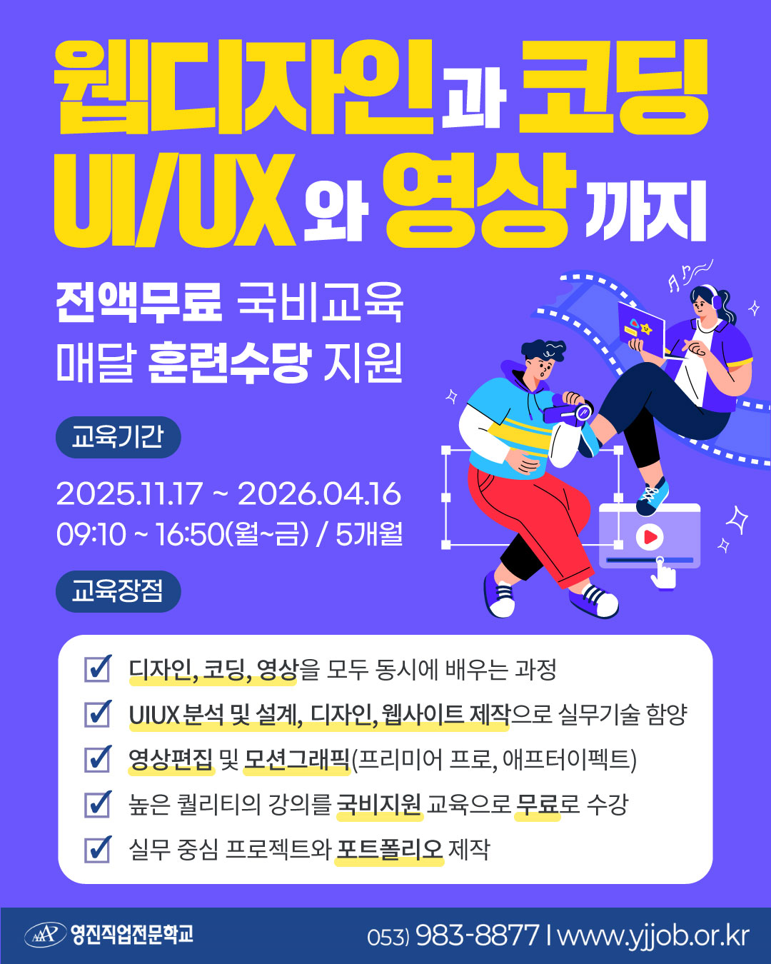 본 과정은 대구 국비지원 무료교육으로 4차 산업혁명 시대에 필요한 디자인과 코딩 기술 을 동시에 배우는 과정입니다.