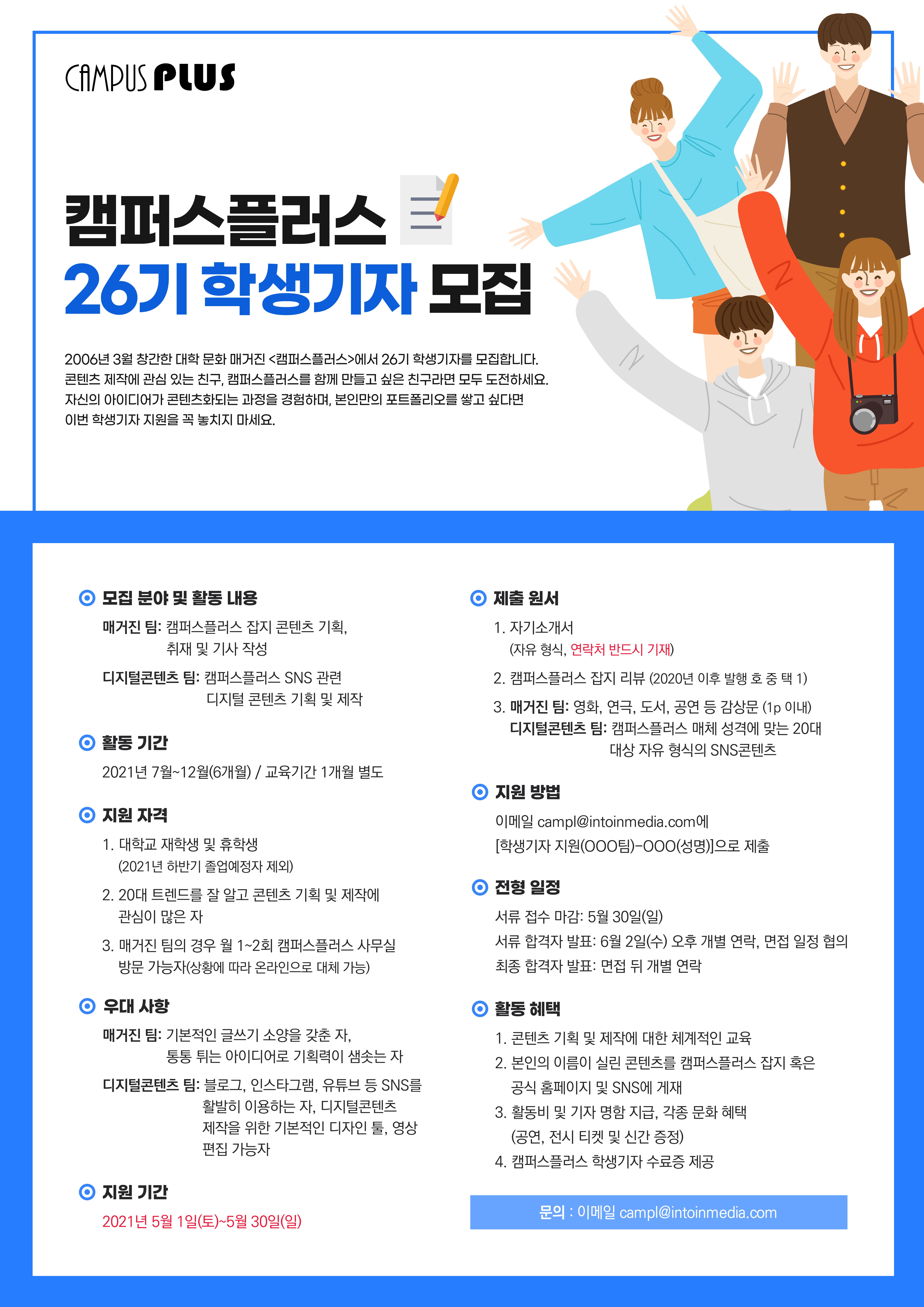 2006년 3월 창간한 대학 문화 매거진 <캠퍼스플러스>에서 26기 학생기자를 모집합니다. 콘텐츠 제작에 관심 있는 친구, 캠퍼스플러스를 함께 만들고 싶은 친구라면 모두 도전하세요. 자신의 아이디어가 콘텐츠화되는 과정을 경험하며, 본인만의 포트폴리오를 쌓고 싶다면 이번 학생기자 지원을 꼭 놓치지 마세요.