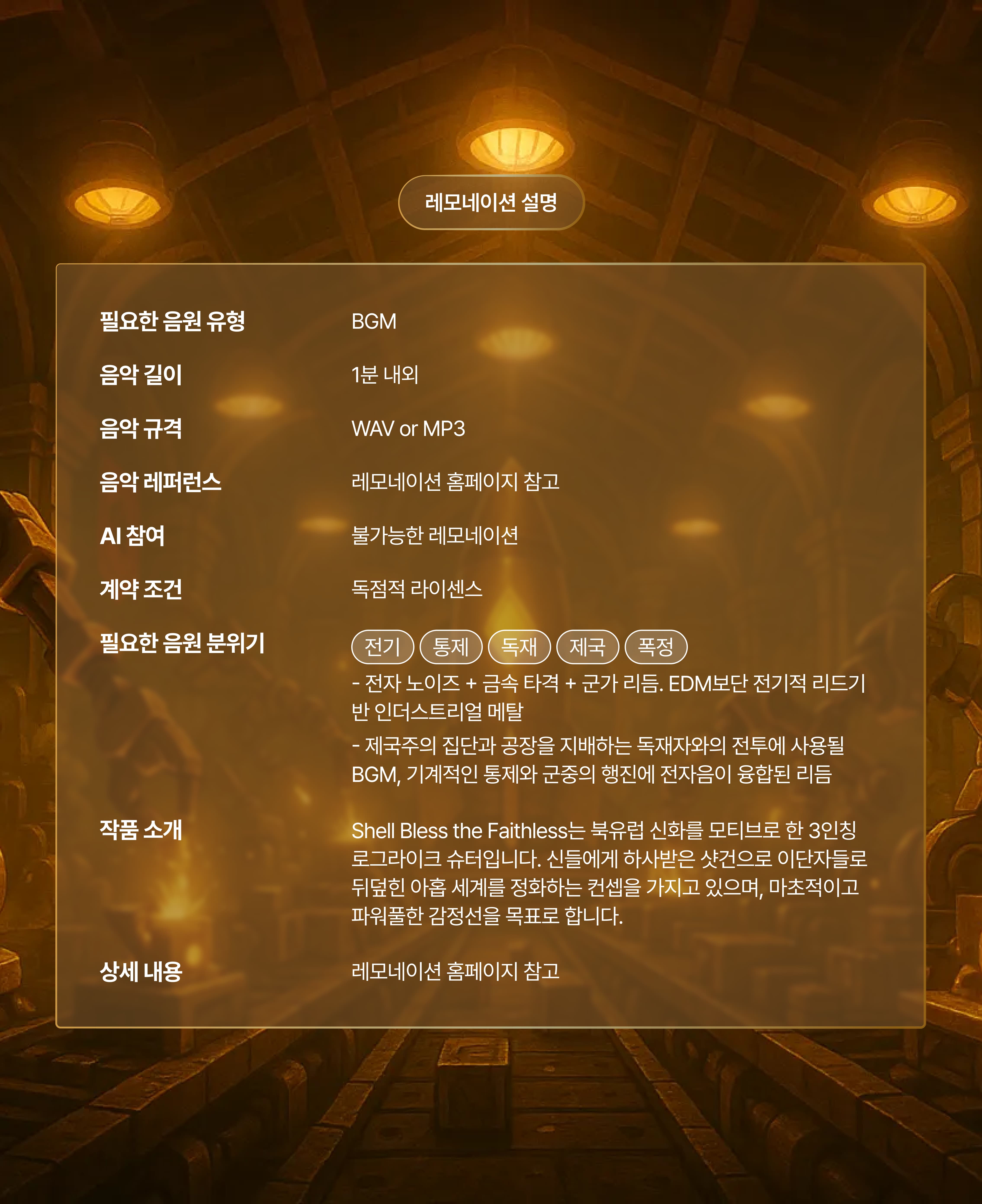 게임 소개: hell Bless the Faithless는 북유럽 신화를 모티브로 한 3인칭 로그라이크 슈터입니다. 신들에게 하사받은 샷건으로 이단자들로 뒤덮힌 아홉 세계를 정화하는 컨셉을 가지고 있으며, 마초적이고 파워풀한 감정선을 목표로 합니다.
