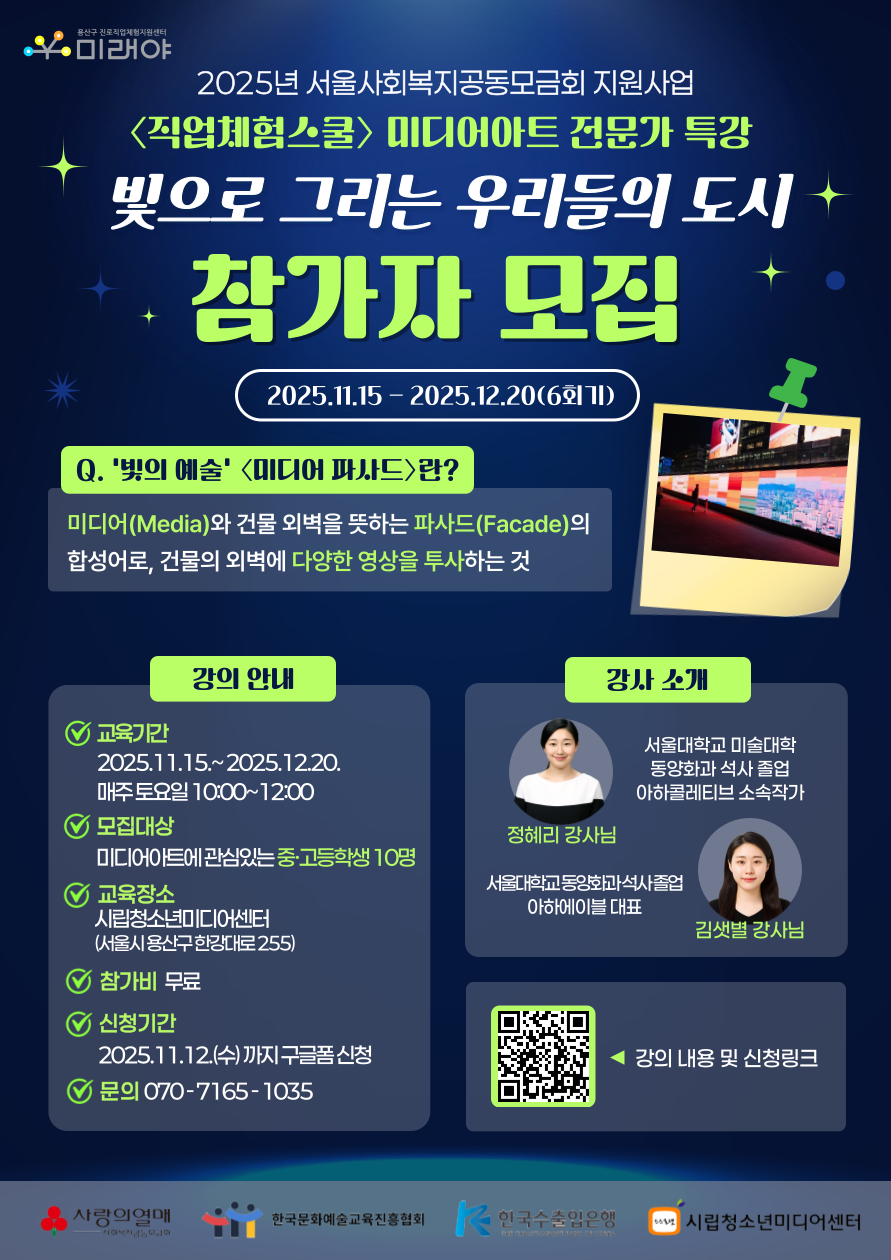 용산구진로직업체험지원센터 '미래야'에서 빛으로 그리는 우리들의 도시 <직업체험스쿨> 미디어아트 전문가 특강 참가 청소년을 모집합니다.