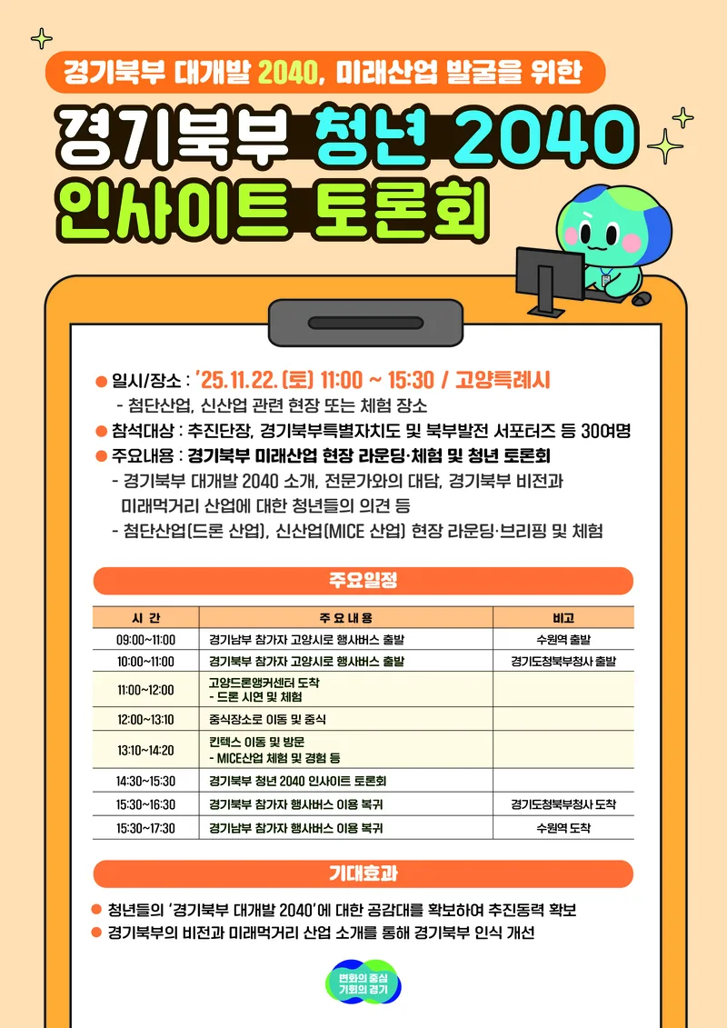 - 청년을 위한 뜻깊은 행사인 경기북부 미래산업 현장체험 및 전문가 초청 강연이 무료로 진행될 예정입니다. 경기북부 대개발 2040 소개 , 전문가와의 대담 , 경기북부 비전과 미래먹거리 산업에 대한 청년들의 의견 , 첨단산업 (드론산업) , 신산업 ( MICE 산업) 현장 라운딩 , 브리핑 및 체험