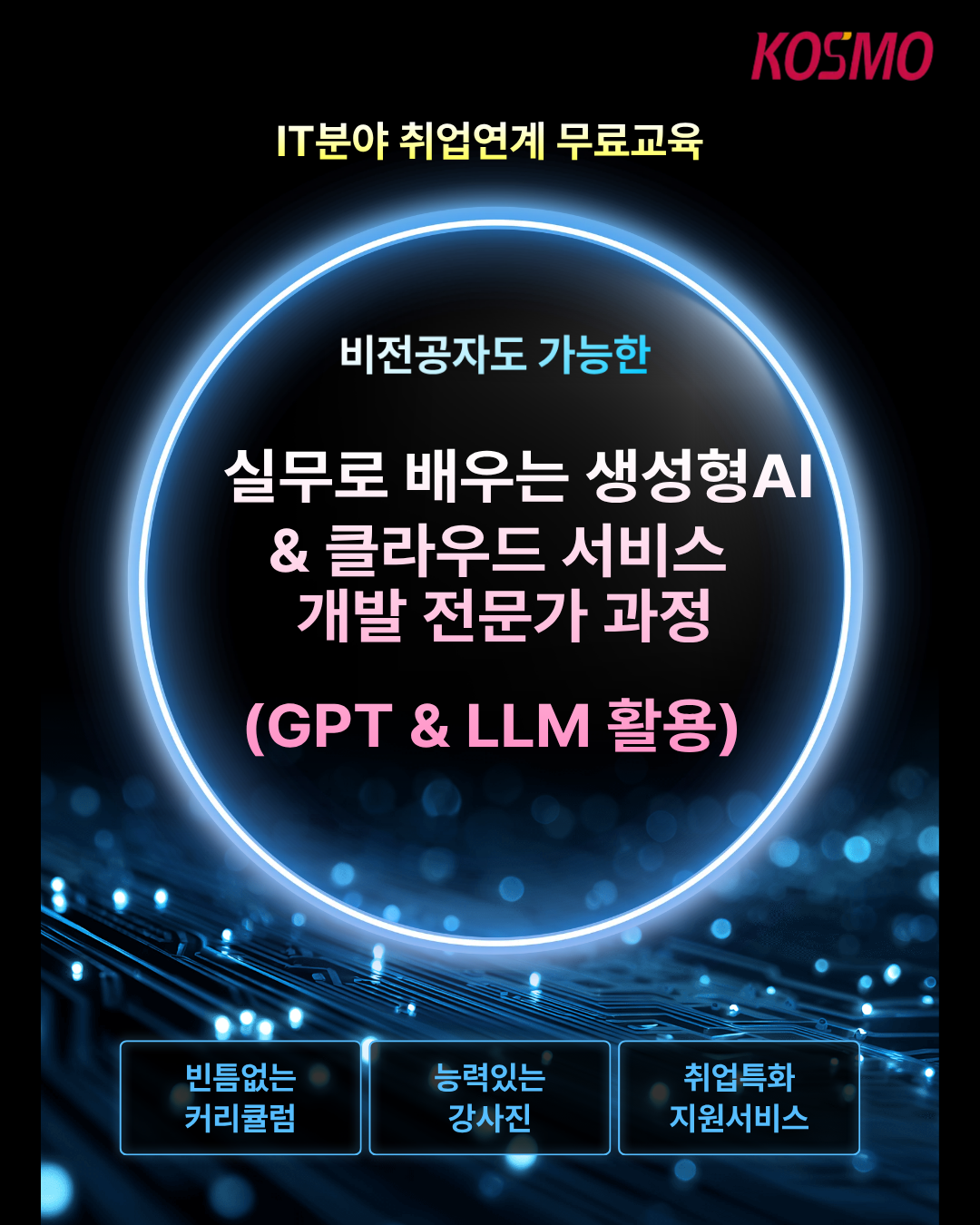 AI와 클라우드 시대에 맞춘 취업맞춤형 실무 중심 커리큘럼으로 구성되어 있습니다.