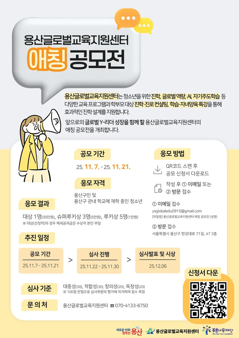 앞으로의 글로벌 Y-리더 성장을 함께 할 용산글로벌교육지원센터의 애칭 공모전을 개최하오니 많은 참여 부탁드립니다.