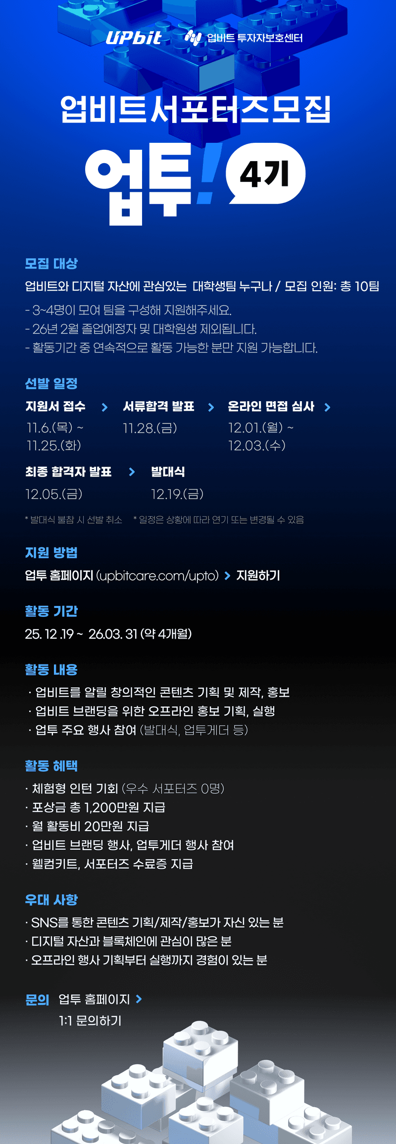 가장 신뢰받는 디지털 자산 거래소 업비트에서 대학생 서포터즈 ‘업투 4기' 를 모집합니다.