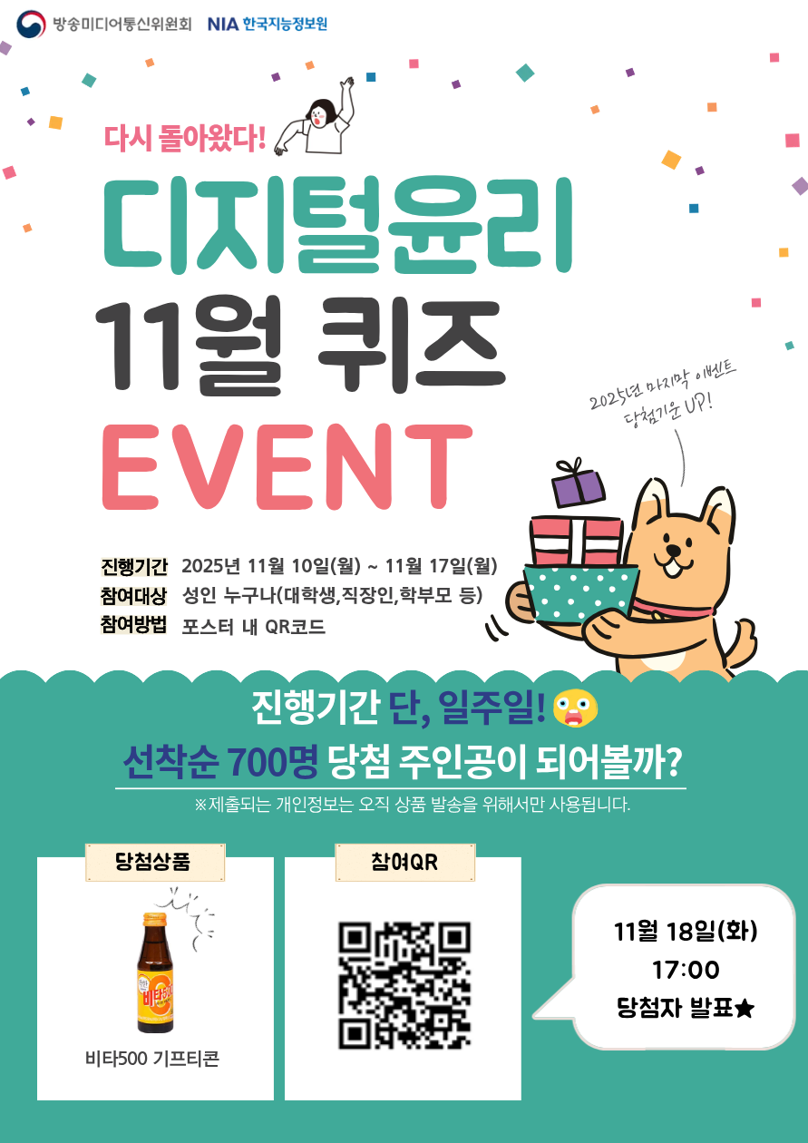 디지털윤리에 대한 영상을 보고 퀴즈를 맞추면 선물을 드리는 이벤트를 진행하고 있습니다.