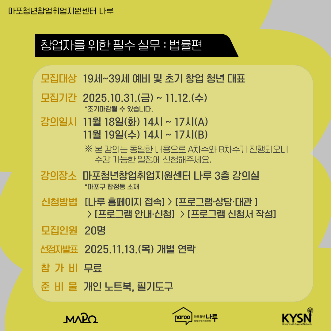 ✔ 강의장소 : 마포청년창업취업지원센터 나루 내 강의실(오르락)