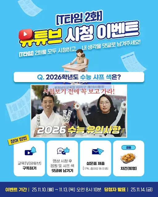영상 시청 후 수험생 응원 메시지 + 2026 수능 샤프 예상 색상을 댓글로 남기기