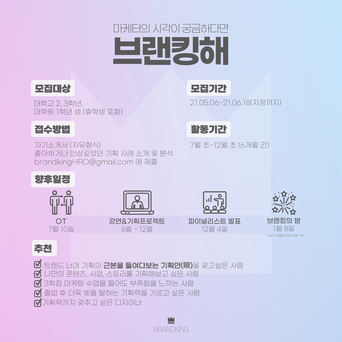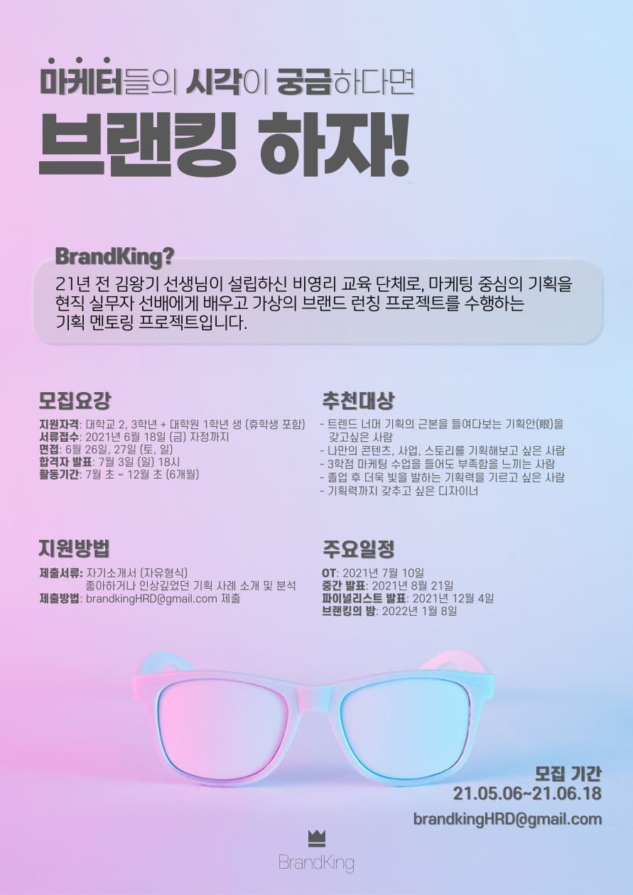 접수방법: brandkingHRD@gmail.com 이메일 접수