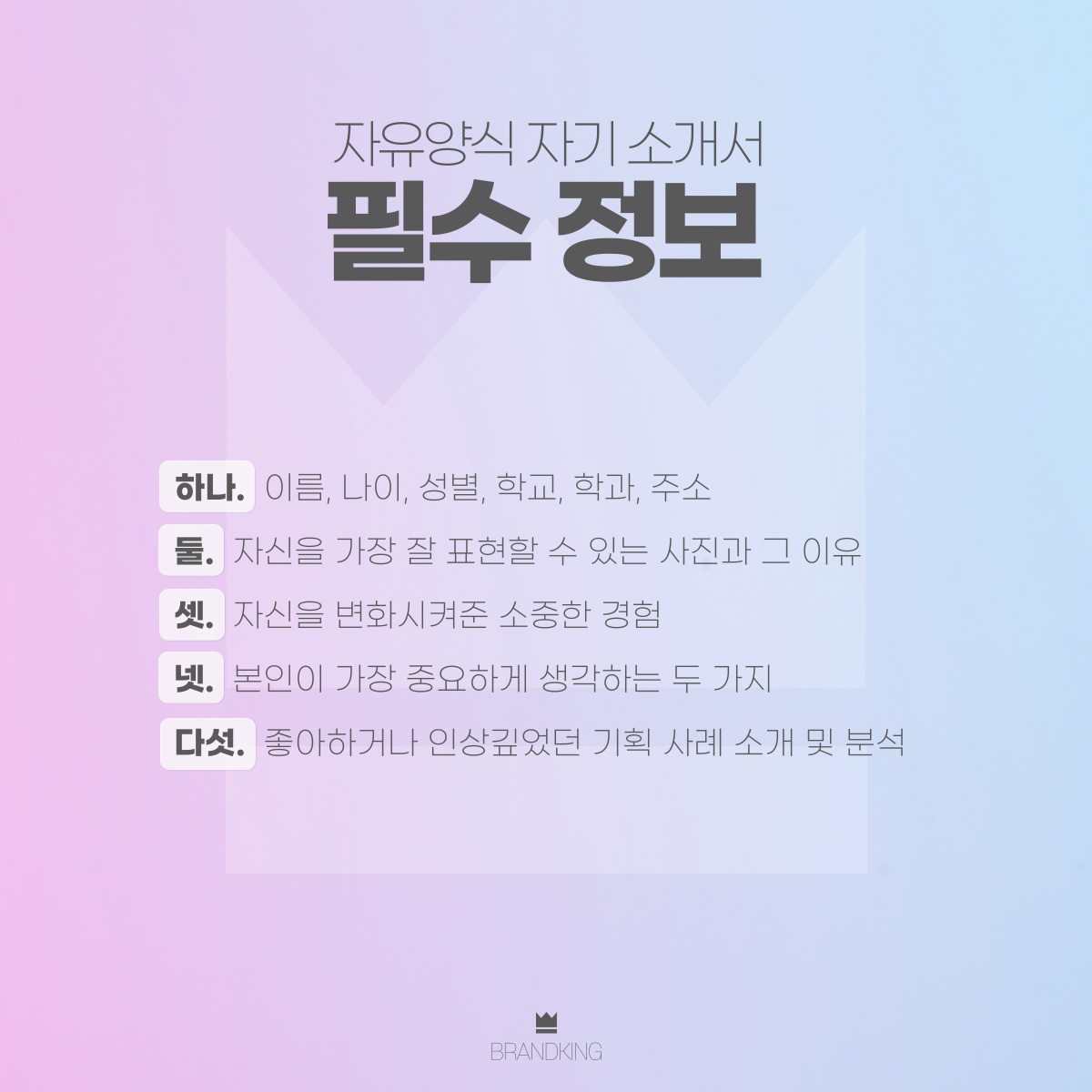 - 단, 자기소개서 내 필수 기입정보는 브랜킹 모두 홈페이지 참고(https://brandkinghr.modoo.at)