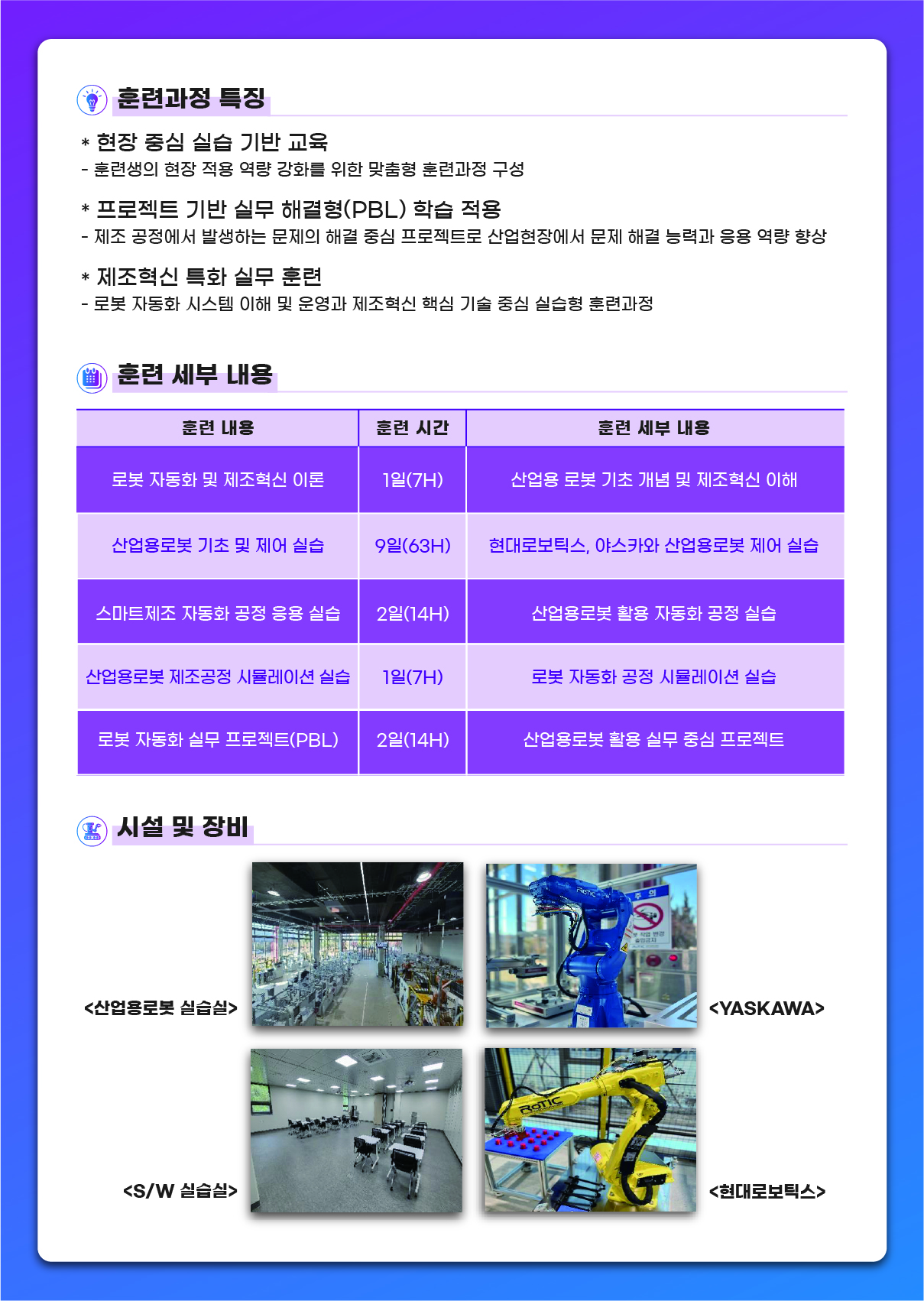 본 훈련은 경북 소재 제조기업 로봇 자동화 공정 활용 기업 및 구축예정 기업 재직자 대상으로 ‘산업용로봇 제조혁신 실무 역량 향상과정’을 국비지원 무료로 제공하오니 관심 있는 분들의 많은 지원 부탁드립니다.