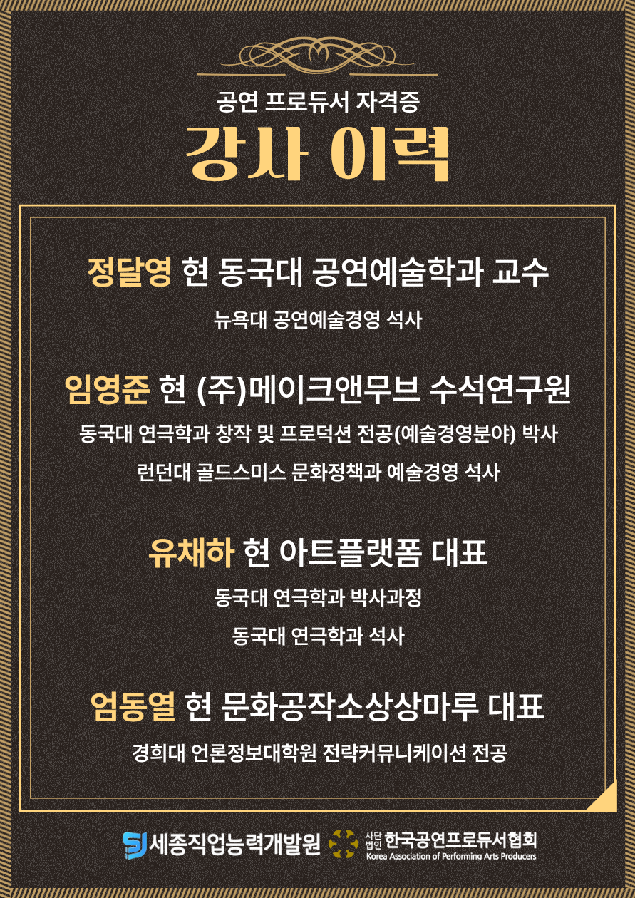 공연 프로듀서는 공연 작품의 기획, 제작, 유통을 총괄하는 전문가로, 시장환경분석을 통해 작품을 개발(선정) 하고, 창작진, 스태프, 출연진을 구성하며, 공연 컨셉에 맞는 홍보 마케팅 전략 및 예산 수립에 따른 재원 조성을 책임지는 자로, 공연 프로듀서 자격은 현장 수요를 반영한 인재를 양성하고, 기업에는 실무 및 현장 지식을 갖춘 인재를 공급하여 취업의 기회를 부여하고 평생교육을 통한 전문인력을 양성하여 사회에 이바지하고자 시행되고 있습니다.