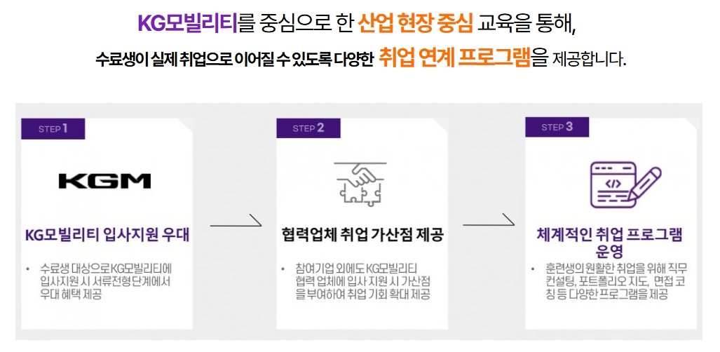 - KGM과의 협업을 통하여 개발된 훈련과정으로서 과정 운영 중 KGM 실무 담당자를 통한 특강 및 멘토링 일정이 편성되어 있습니다.