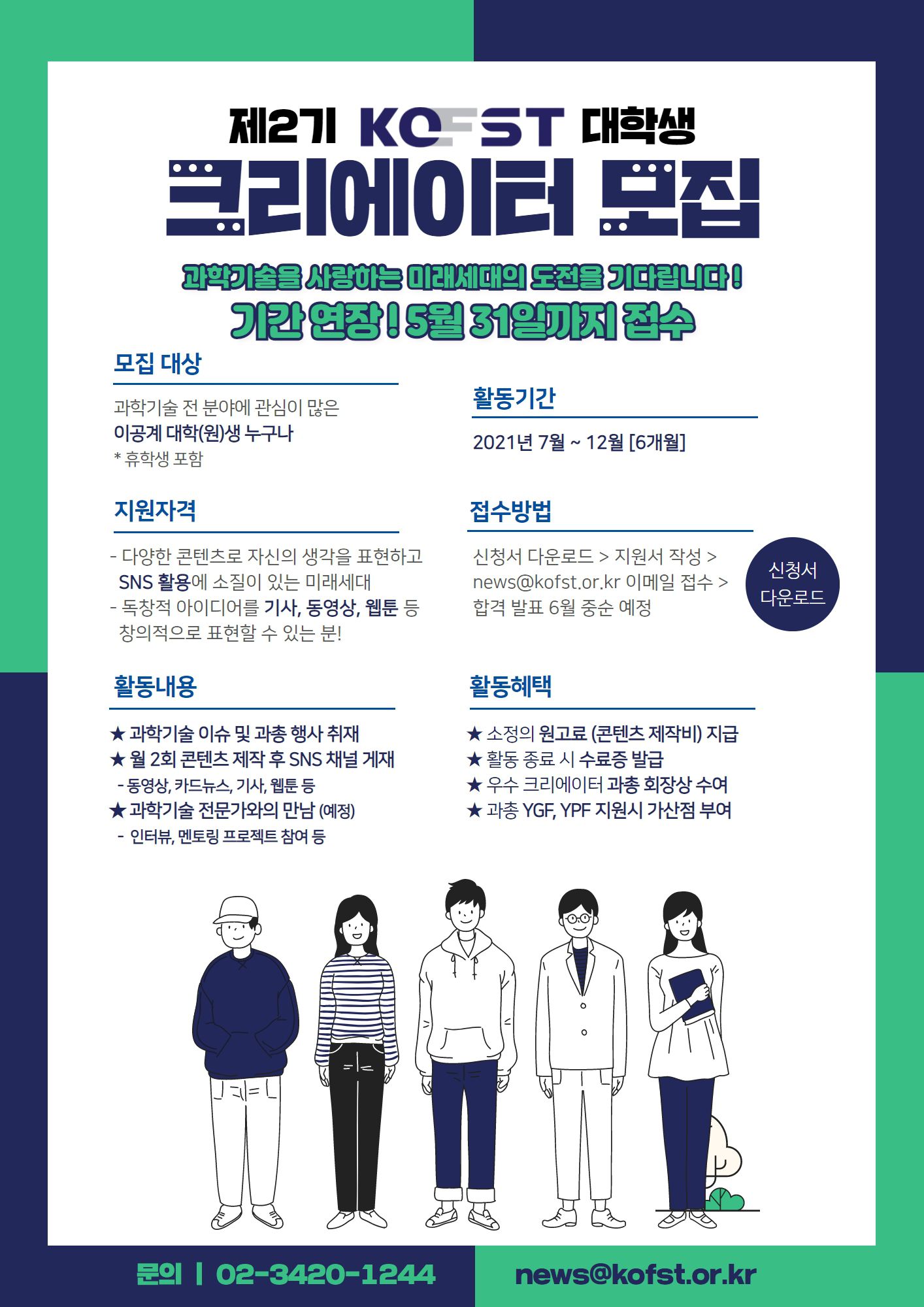 - 한국과총 블로그에서 신청서를 다운로드하고 작성하신 후 news@kofst.or.kr 로 메일을 보내주세요!