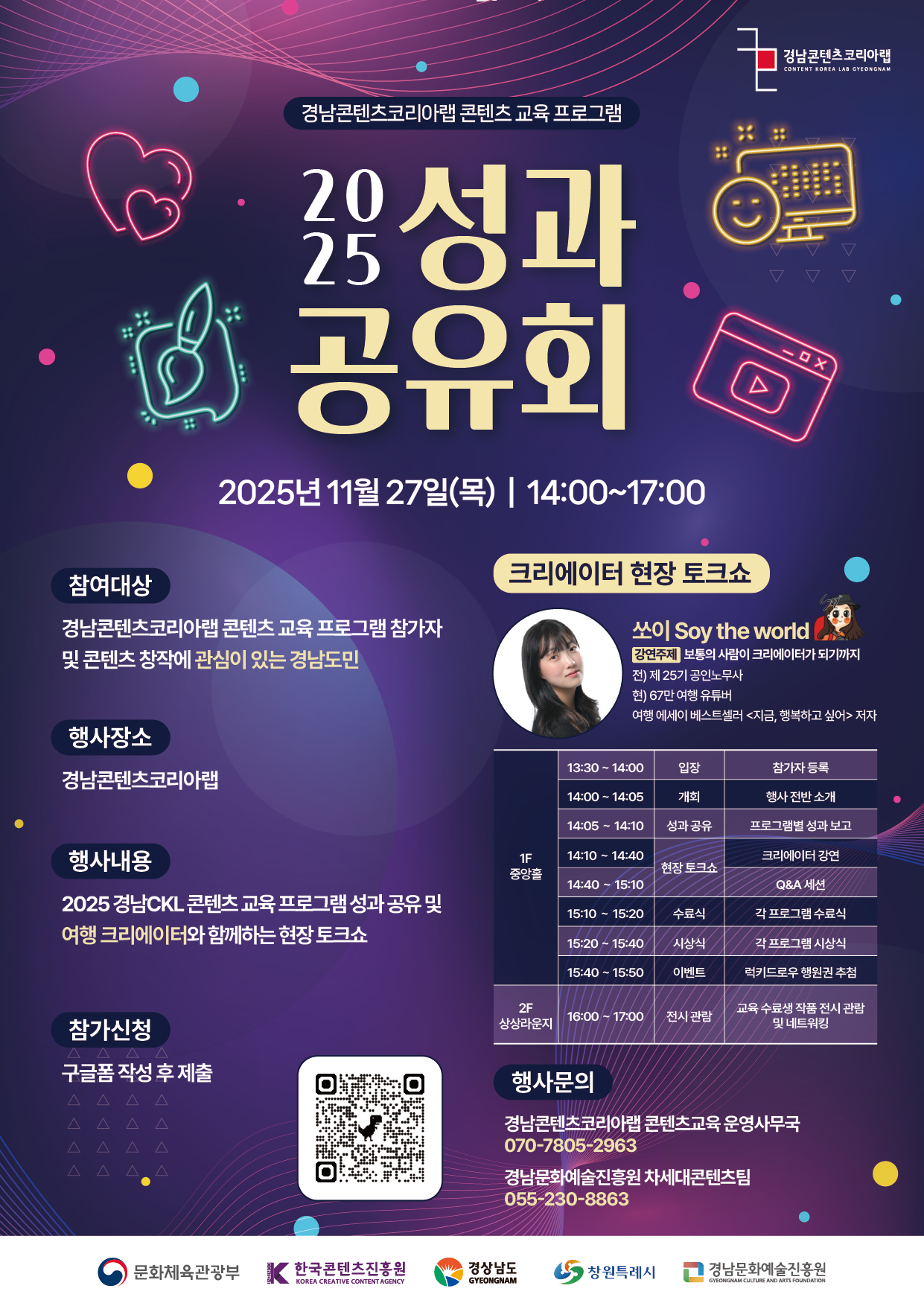 - 행사 내용 : 콘텐츠 교육 프로그램 성과공유 및 크리에이터 현장 토크쇼(구독자 67만 여행 크리에이터 Soy the world)