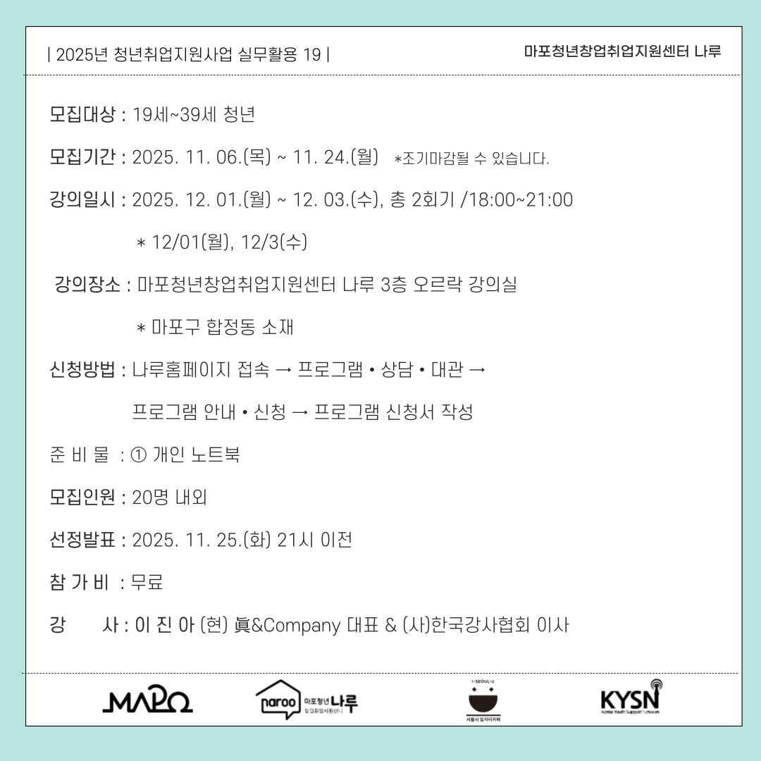 ✔ 강의장소 : 마포청년창업취업지원센터 나루 내 강의실(오르락)