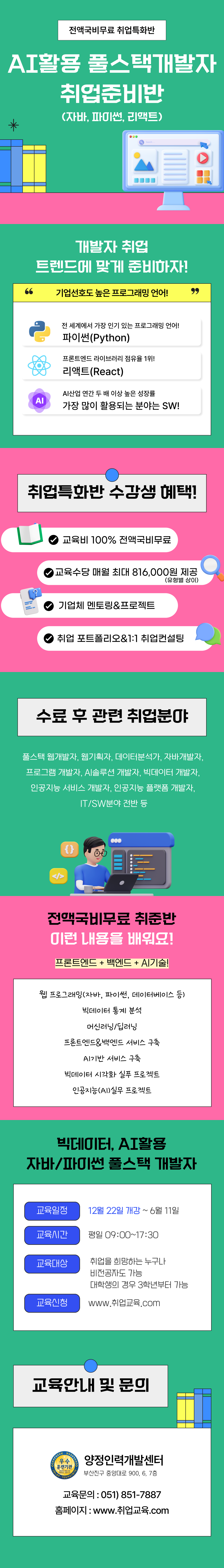 - 과정명 : 빅데이터 AI활용 자바/파이썬 기반 풀스택개발자 양성