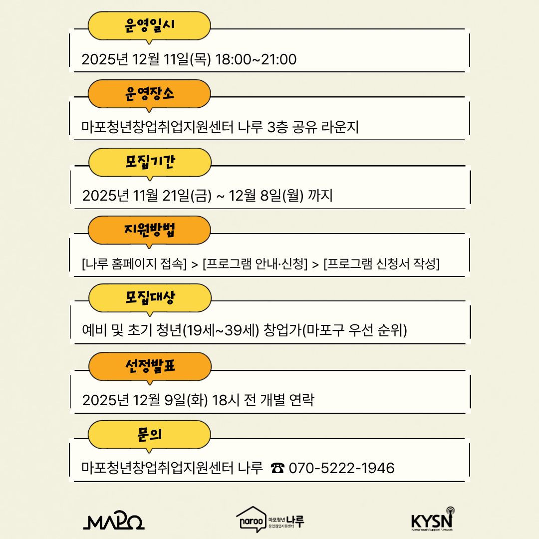 ✔ 문의: 마포청년창업취업지원센터 나루 ☎070-5222-1946