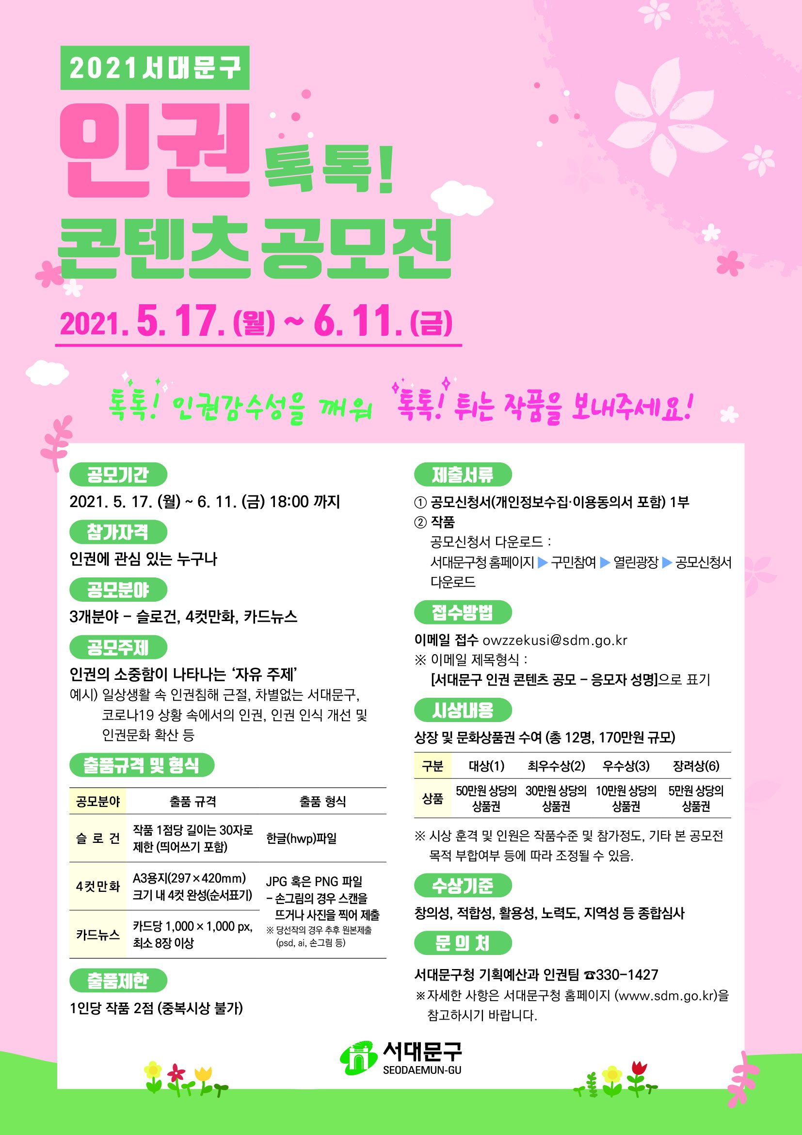 인권 감수성을 함양하고 인간의 존엄성 및 인권의 가치를 되새기기 위한‘2021 서대문구 인권 톡톡 콘텐츠 공모전’을 운영 하오니 인권에 관심 있는 여러분의 적극적인 참여를 바랍니다.
