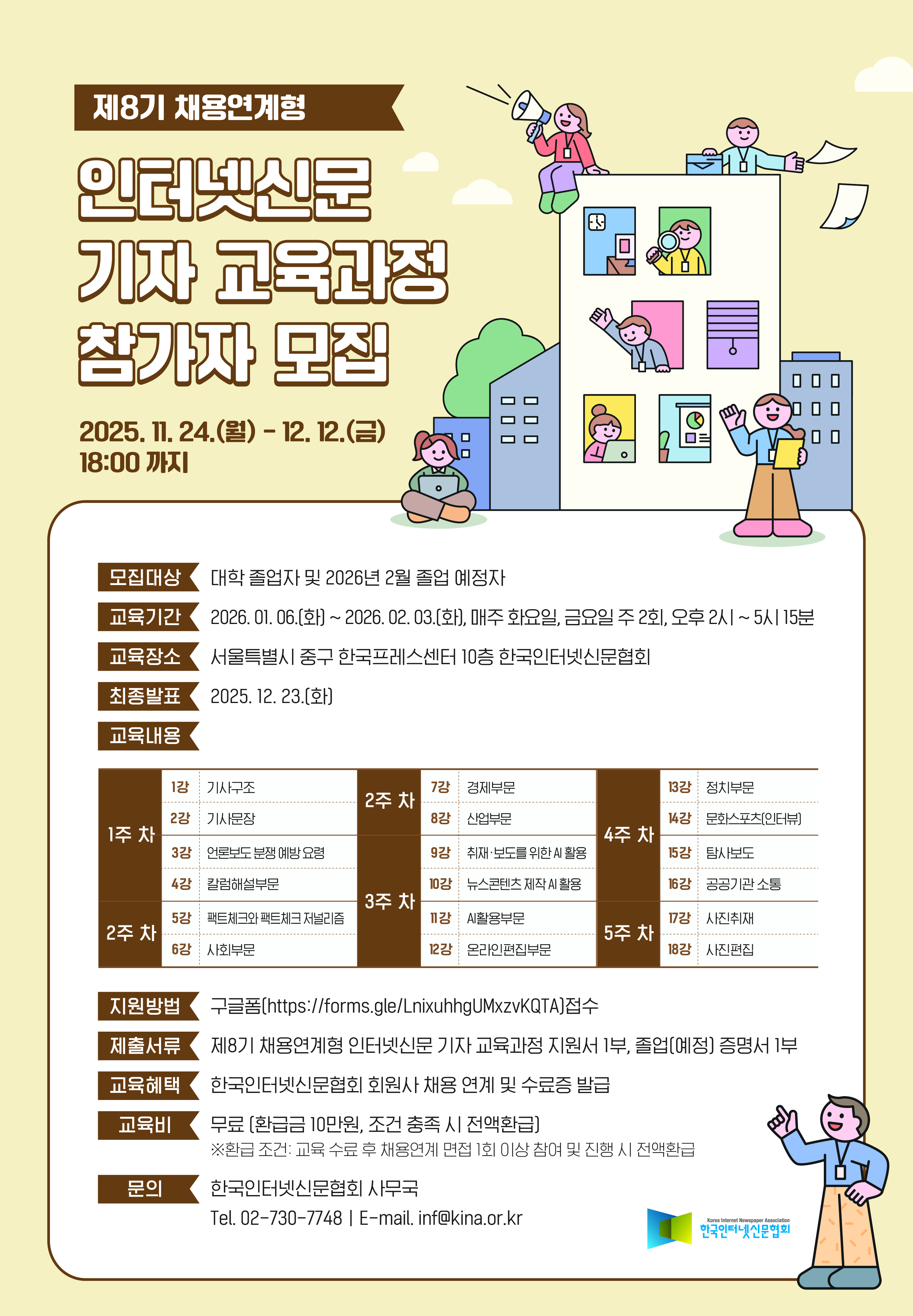 □ 문의 : 한국인터넷신문협회 사무국(02-730-7748, inf@kina.or.kr), 기자교육 담당자 (070-4333-3530)