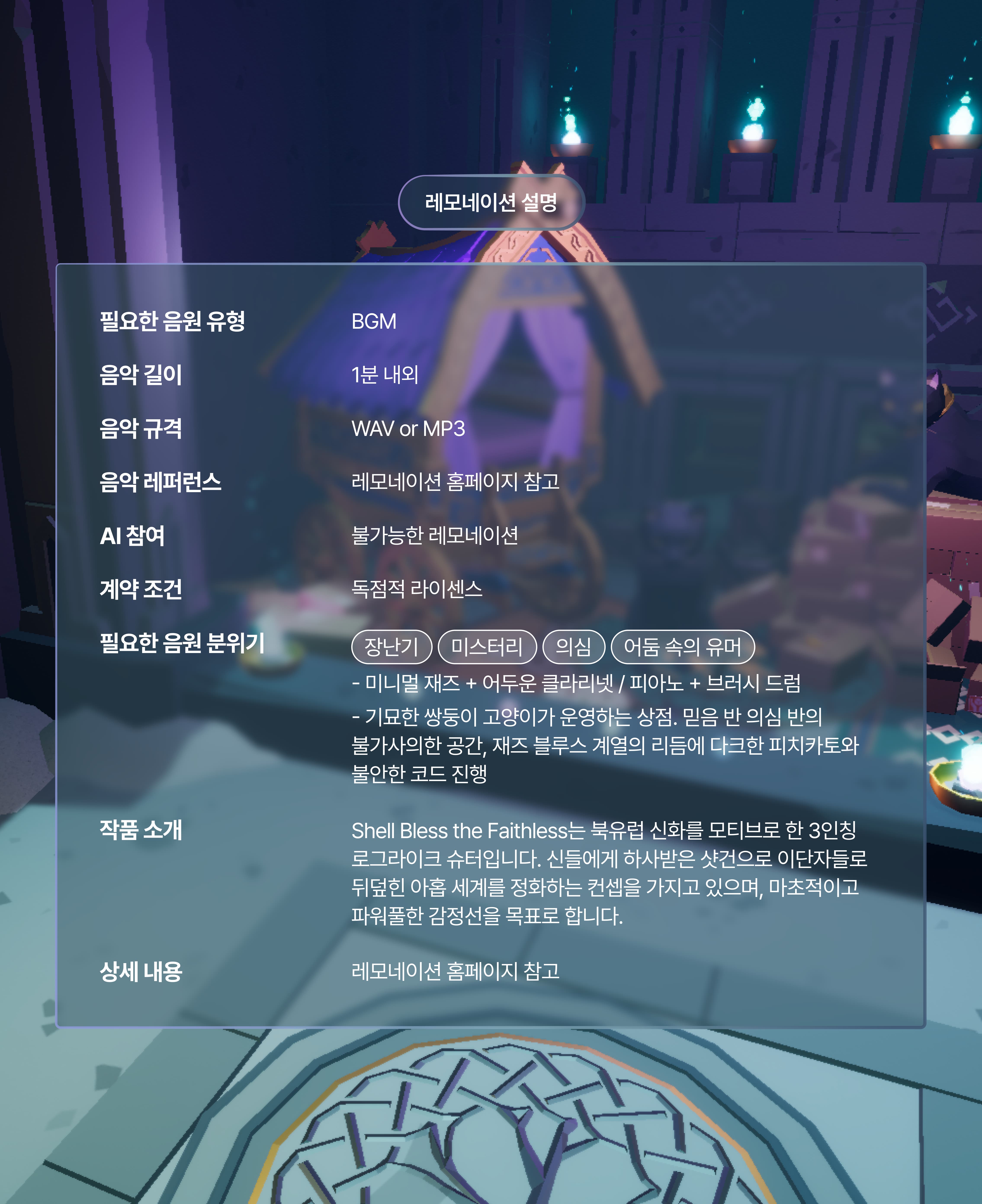 게임 소개: Shell Bless the Faithless는 북유럽 신화를 모티브로 한 3인칭 로그라이크 슈터입니다. 신들에게 하사받은 샷건으로 이단자들로 뒤덮힌 아홉 세계를 정화하는 컨셉을 가지고 있으며, 마초적이고 파워풀한 감정선을 목표로 합니다.