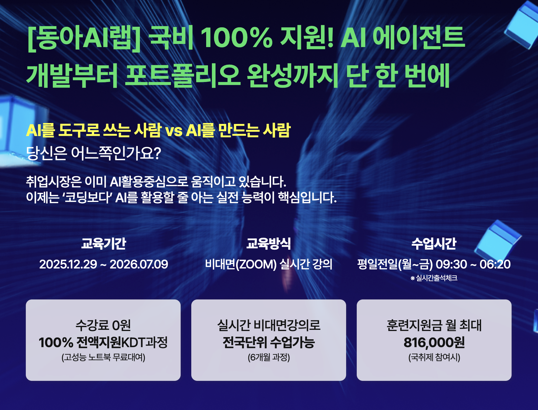 동아 Ai랩의 KDT AI Agent 과정은 정부지원으로 누구나 부담 없이 참여할 수 있는 실무 중심 프로그램입니다.